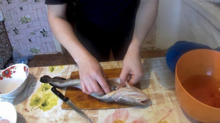 Далее, необходимо удалить кожицу с поверхности тела налима. Мясо отслаивается от костей и перекладывается в отдельную емкость.