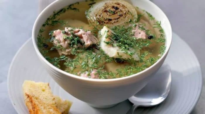 - По истечении времени бульон цедится через сито, затем вновь помещается на огонь. После закипания добавляется оставшаяся рыба и лук. Необходимо снимать пенку. Варить нужно в течение примерно 20 минут.