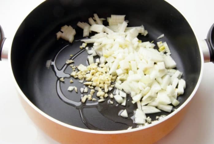 На сковороде в оливковом масле обжариваем лук и чеснок до прозрачности