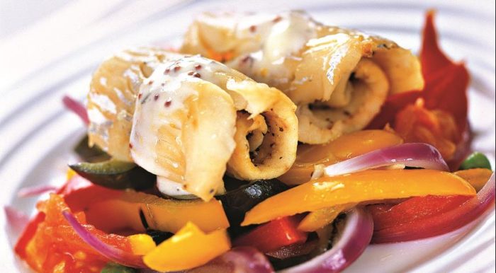 Рыбу тщательно промыть и убрать ненужную жидкость с помощью бумажных салфеток или полотенец. Посолить, поперчить и слегка сбрызнуть лимонным соком, сделать из филе пикши небольшие рулеты.