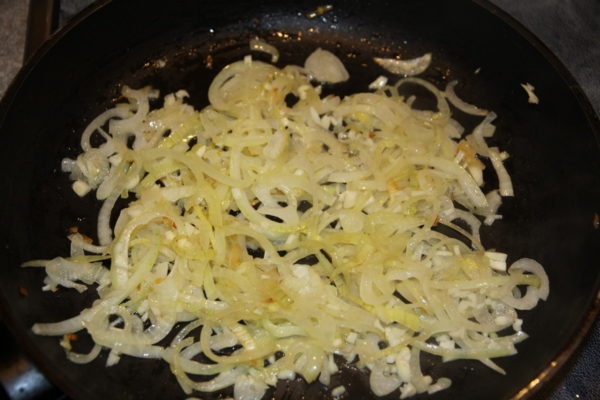 Растопить 30 г. масла в сотейнике, обжарить лук-шалот до золотистого цвета и мягкой консистенции.