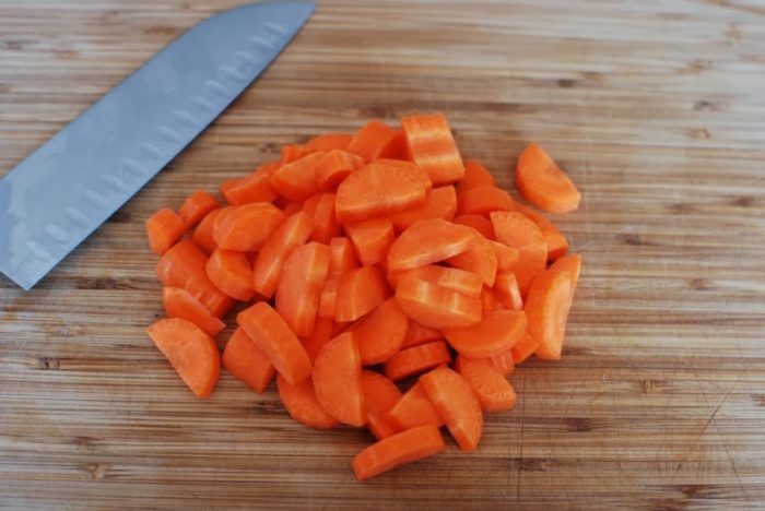 - Отварить картофель, морковь и яйцо. Порезать кубиками.