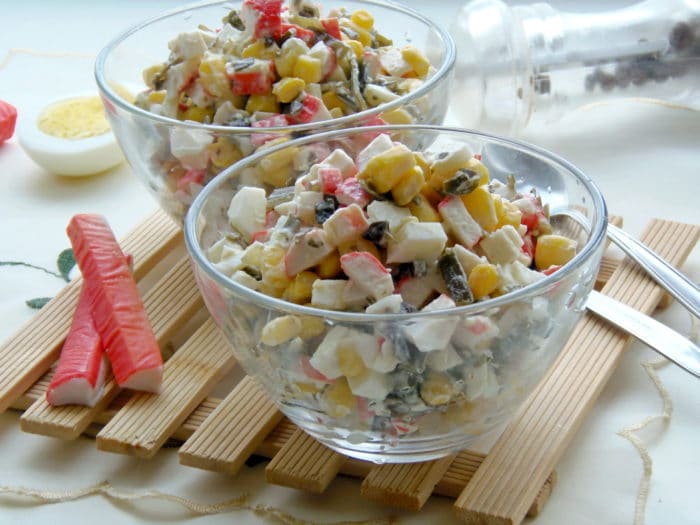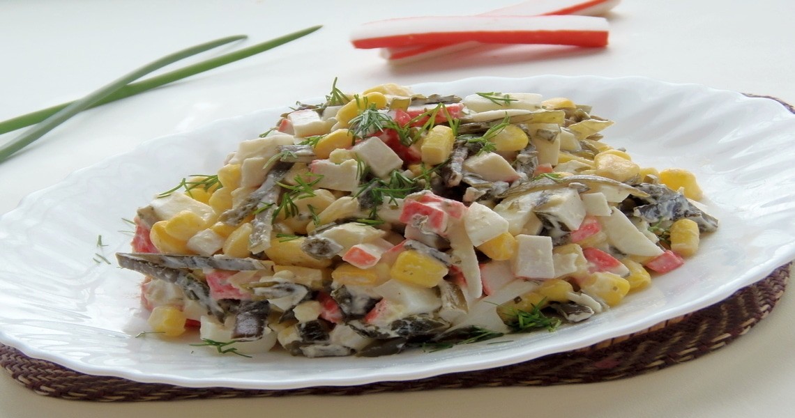 Но далеко не всем нравится своеобразный вкус ламинарии – таково научное название этого удивительного растения. Мы прибегнем к небольшой хитрости и замаскируем лёгкую пикантность съедобной водоросли, приготовив вкусный салатик с кукурузой и всеми любимыми крабовыми палочками.