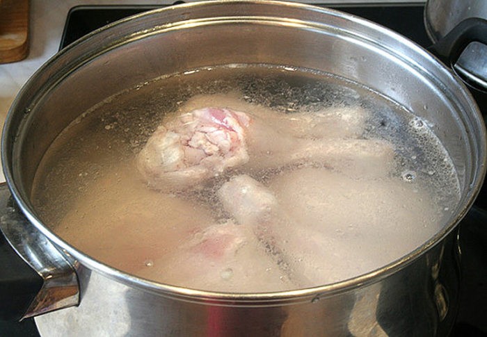 - Готовую запеченную курицу очищаем от мяса. Оставшиеся косточки заливаем водой, добавляем крупно рубленые овощи, чеснок, петрушку, капусту морскую и варим 30-45 минут. После готовности бульон сцедить.