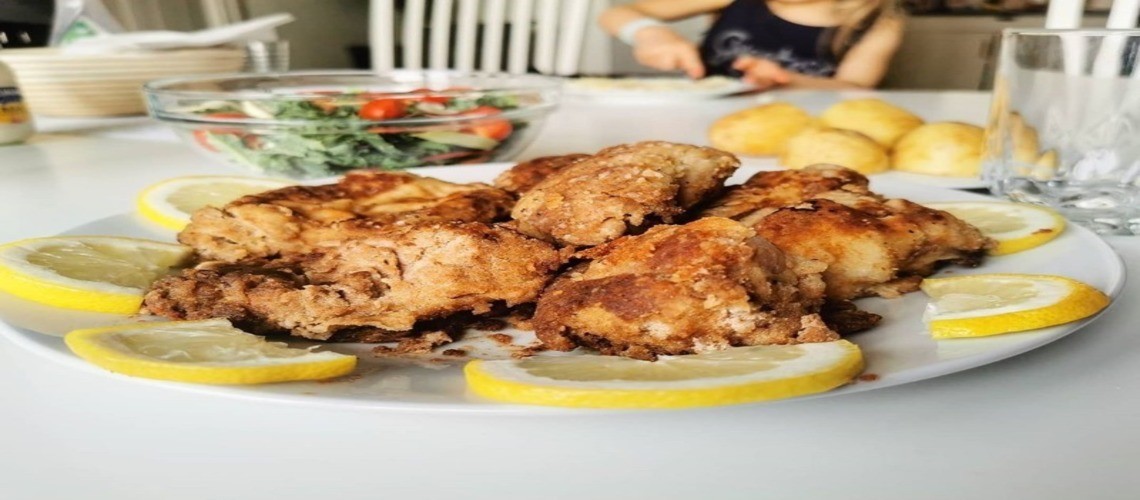 В сковороде хорошо прогреть масло, обжарить до золотистого цвета кусочки со всех сторон. Готовое блюдо уложить на бумажное полотенце, чтобы оно впитало в себя лишнее масло. Переложить на тарелку, выдавить из половинки лимона сок и подавать к столу.