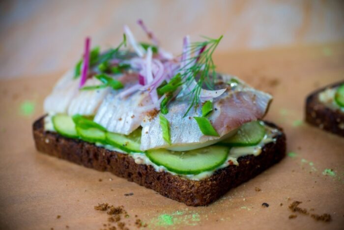 Теперь положите рыбку на подготовленный хлеб. Перед подачей украсьте получившийся сэндвич веточкой петрушки и укропа.
