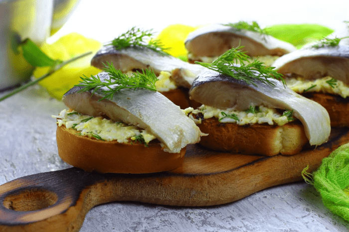 Для данной закуски возьмите ржаную булочку, так как он лучше подойдет к сельди. Почистите рыбку от костей, нарежьте и выложите на хлебушек, намазанный сливочным маслом. Потом мелко нарубите перья лука, укроп, маслины порежьте кружочками.