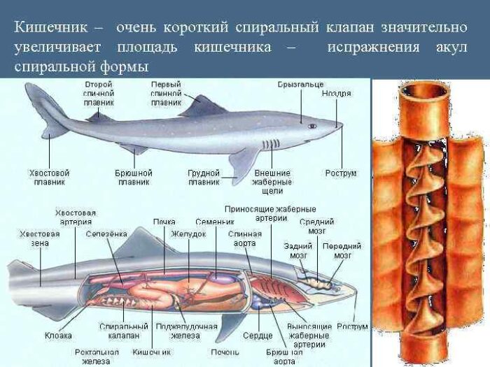 Hondrichthyes также обладают коротким пищеводом. После глотки еда попадает в желудок, где обрабатывается пепсином. Далее обработанная пища попадает в тонкую кишку, но большая часть продвигается дальше к печени и поджелудочной железе. После чего, обработанное сырье попадает в толстую кишку, имеющую вид крюка или винта. Продвижение переработанной еды заканчивается в прямой кишке, которая сразу открывает клоаку. Здесь же находиться половые железы и мочеточник.