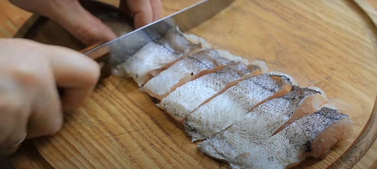 Нарежьте филе хека небольшими кусочками с шириной не более 2 см.