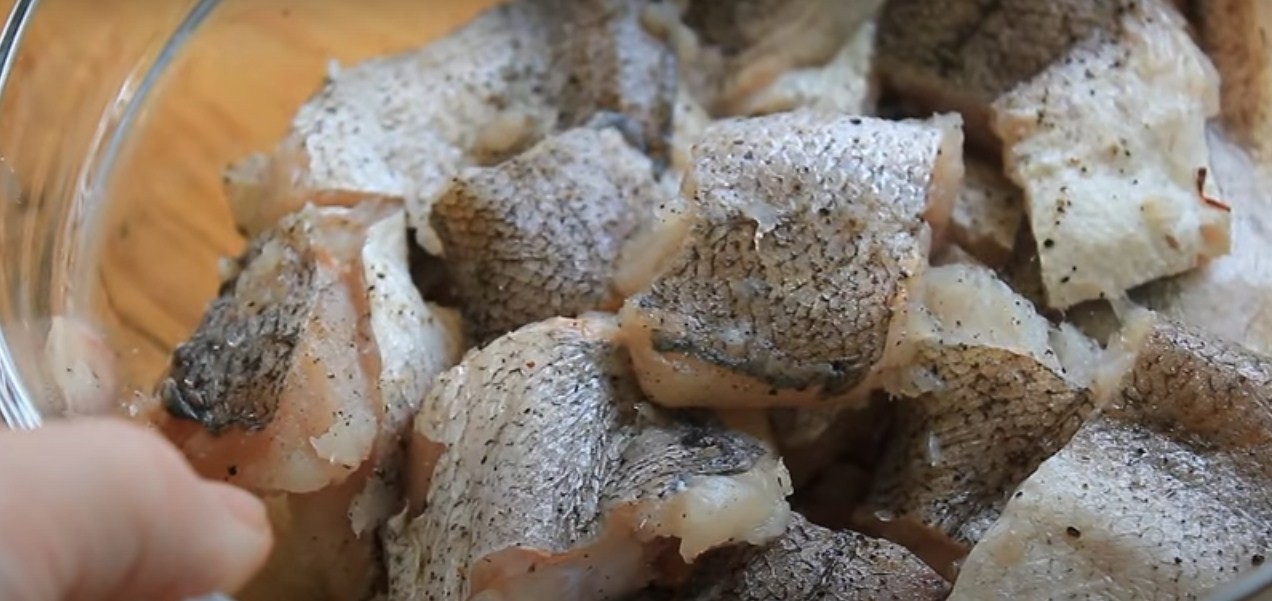 Сложите рыбное мясо в отдельную емкость, посыпьте солью и добавьте молотый перец.
