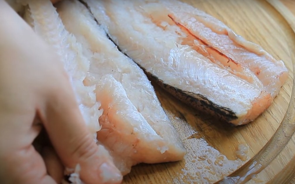 Разморозьте рыбу хек, сделайте глубокие надрезы по спинке и на животе. Отсоедините хребет от одной части филе, а затем снимите вторую. Работайте осторожно, прощупывайте рыбу и следите за тем, чтобы внутри не осталось костей. Обрежьте край филе, чтобы удалить косточки, оставшиеся от плавников.