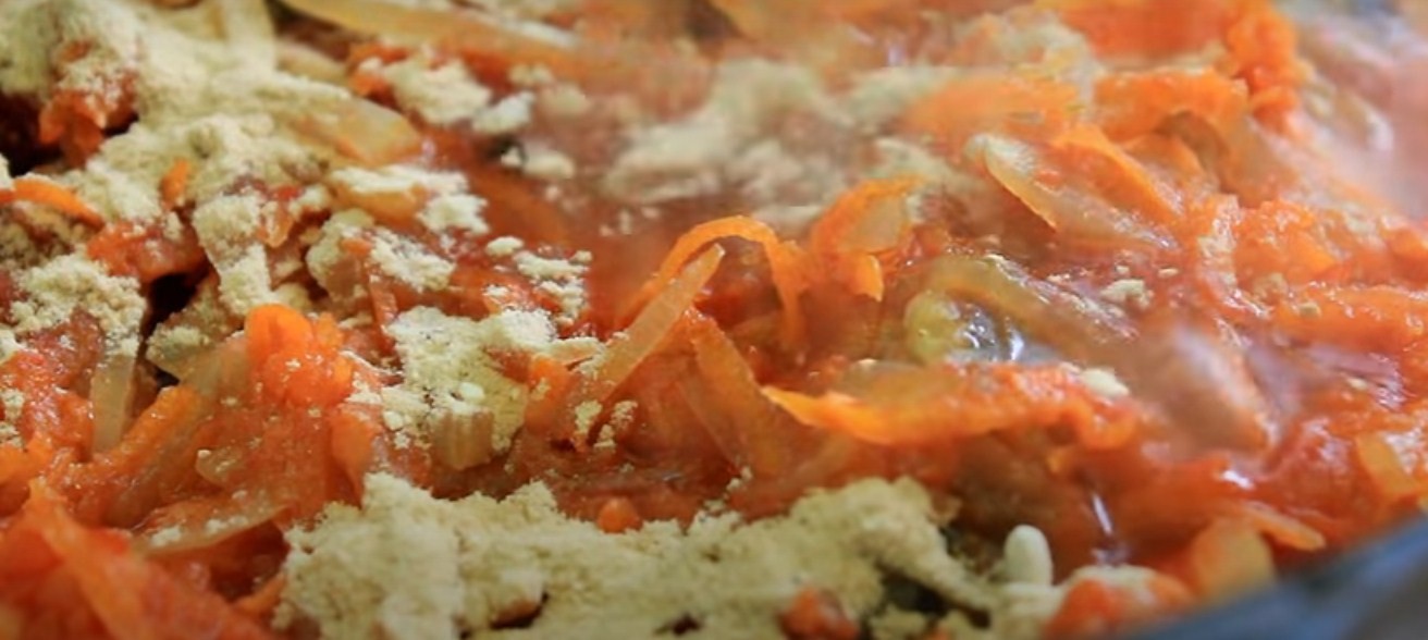 После готовности овощей, влейте в зажарку томатный сок и удерживайте ее на огне в течение 10 минут.