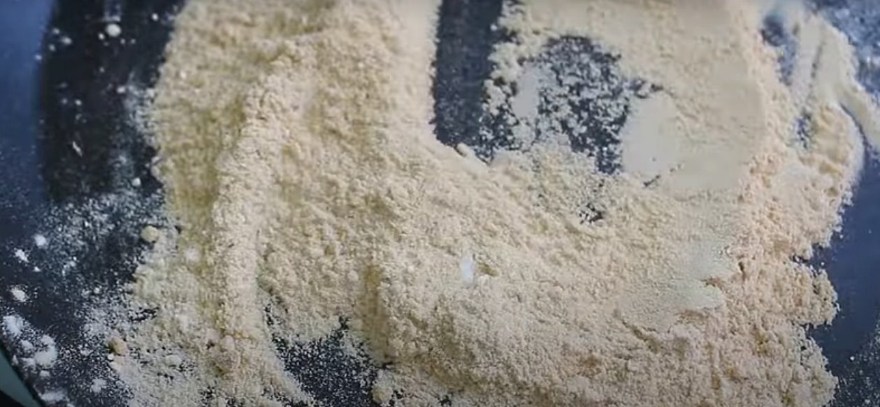 Пока хек тушится вместе с томатом на отдельной сковороде обжарьте муку до золотистого оттенка. Сделать это нужно для того, чтобы томатный соус получился густым.