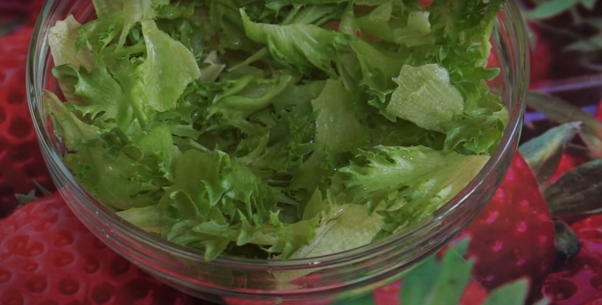 Листья салата не нужно нарезать, лучше порвать их руками в салатник. Кусочки должны быть крупными.
