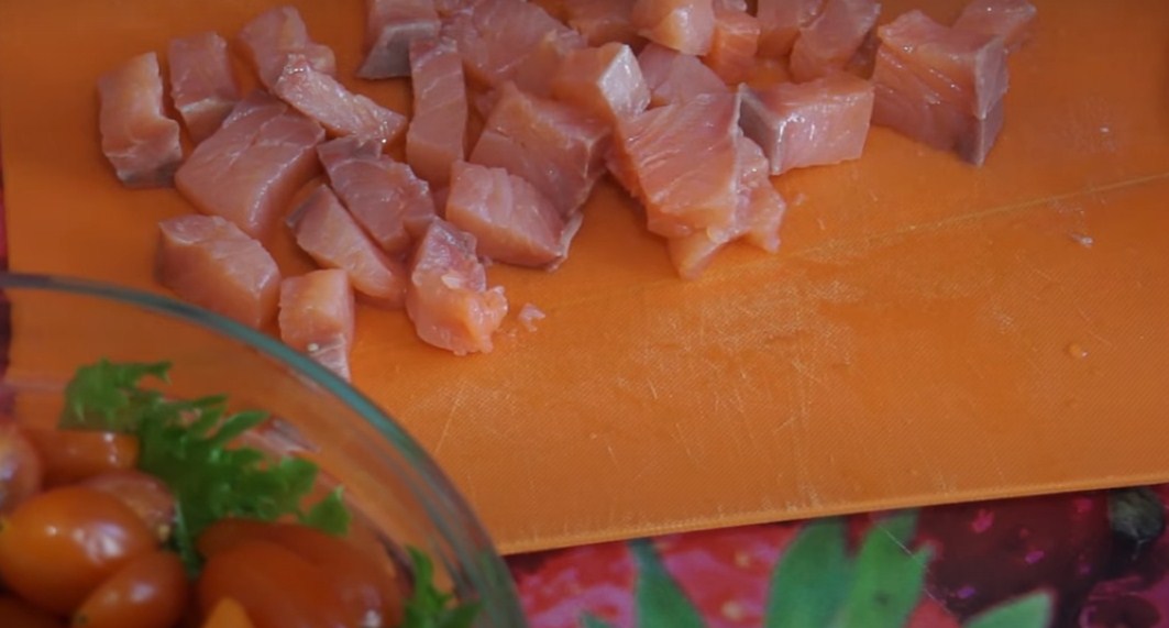 Филе слабосоленой семги нарежьте небольшими кубиками.