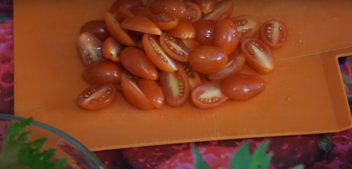 Томаты черри разрежьте пополам. Если используете помидоры другого сорта, нарежьте их дольками, но учитывайте, что слишком сочные сорта не подойдут.