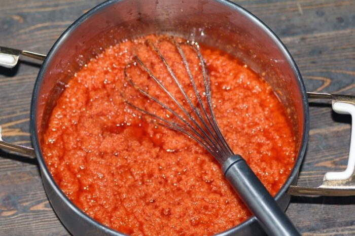 Смешиваем в небольшой кастрюльке томатный сок и масло, доводим до кипения. Далее тонкой струйкой всыпаем манную муку и варим до готовности, не забывая постоянно помешивать. Даем каше остыть.