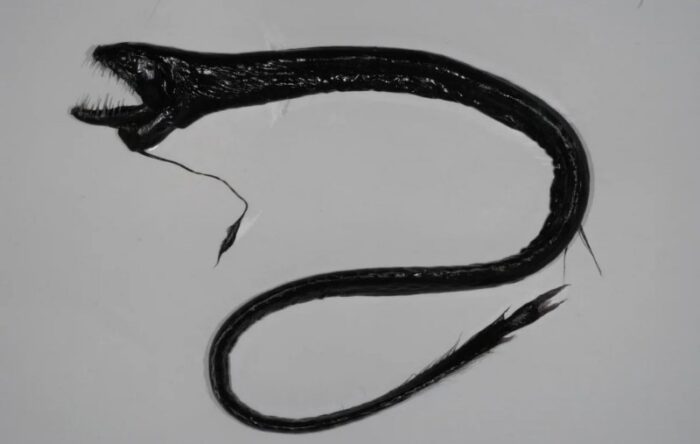 Черная драконовидная рыба — индиакант, обитатель глубоких (до 2000 м) вод теплых тропических морей. У нее нет чешуи, тело очень узкое, тонкое, длинное и гибкое, как у угря, черного цвета, длиной до 40–45 см.