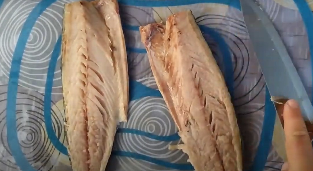 Предварительно достаньте рыбку из морозильной камеры, чтобы она подтаяла. Это нужно для ее комфортной разделки. Удалите голову и плавники, разрежьте рыбу пополам.