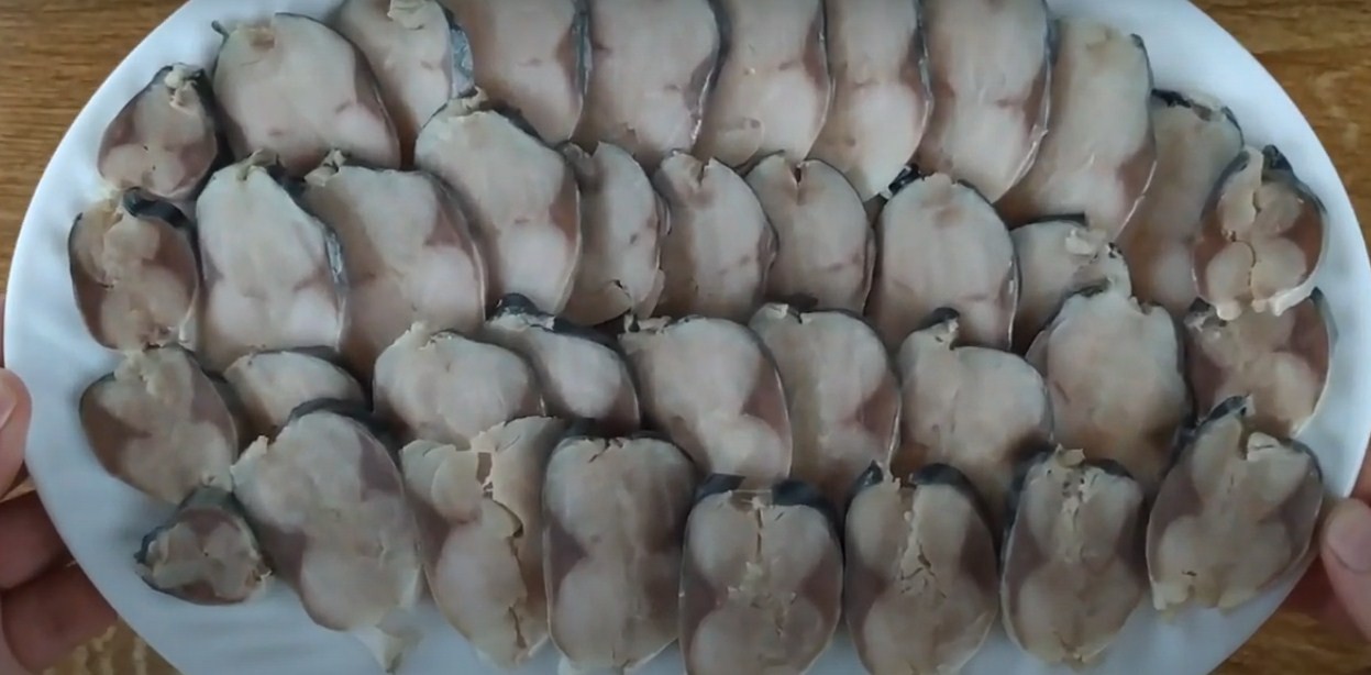 Старайтесь нарезать закуску как можно тоньше, тогда она получится очень нежной.