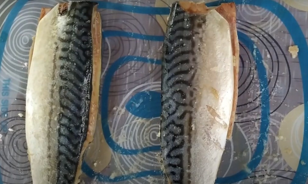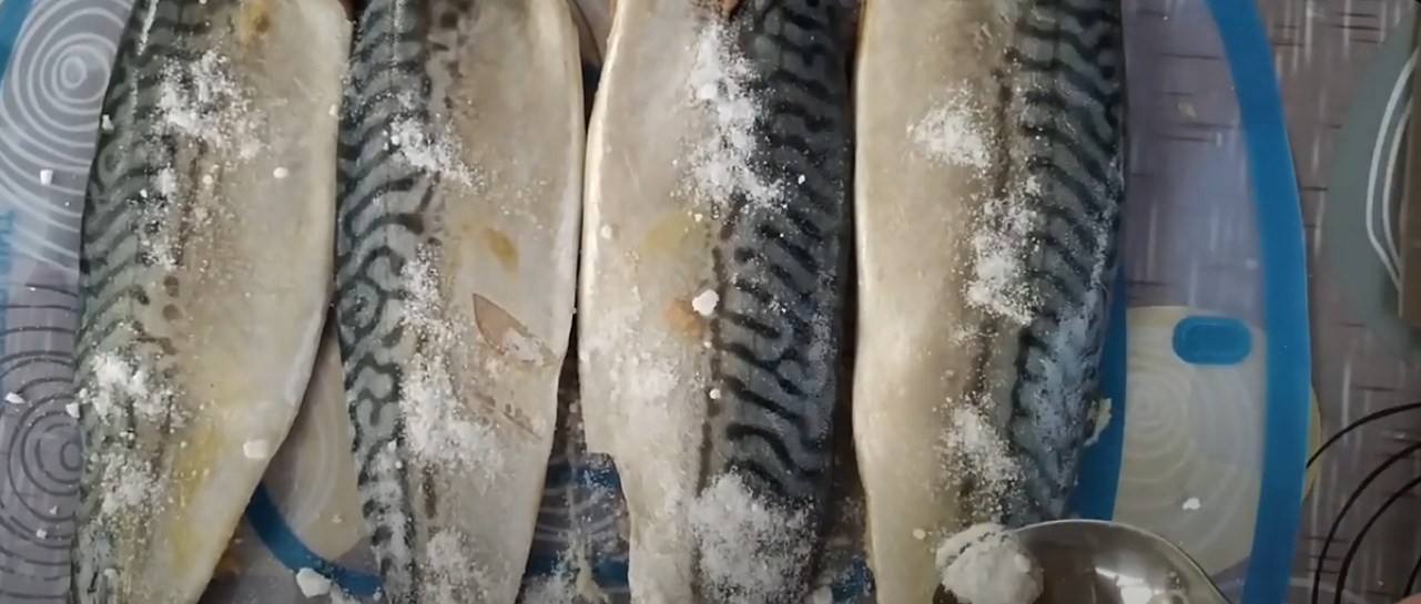 Присыпьте скумбрию солью с двух сторон и осторожно вотрите гранулы, чтобы не повредить кожицу.